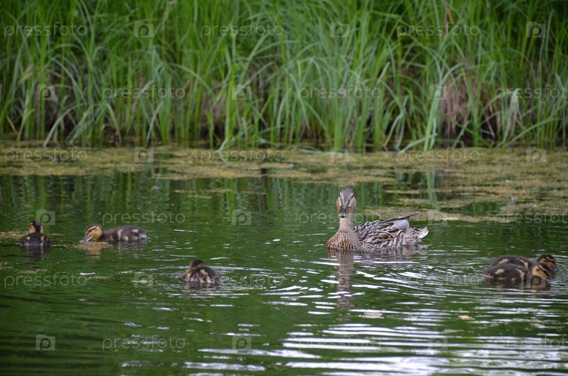 Утка с маленькими утятами плавает в пруду