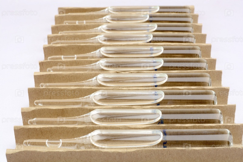 Флакон с вакциной стоит в коробке в ряд. Глюкоза в жидкой форме