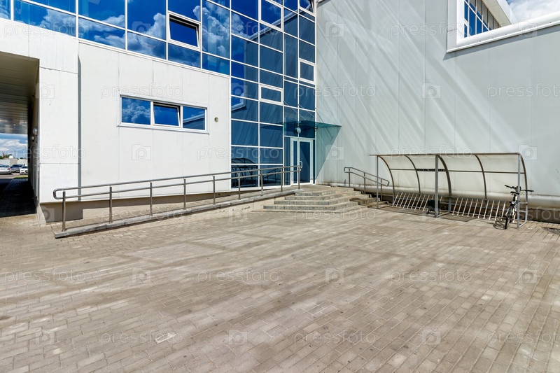 Вход в современное стеклянное здание с велосипедной парковкой и пандусом для инвалидов