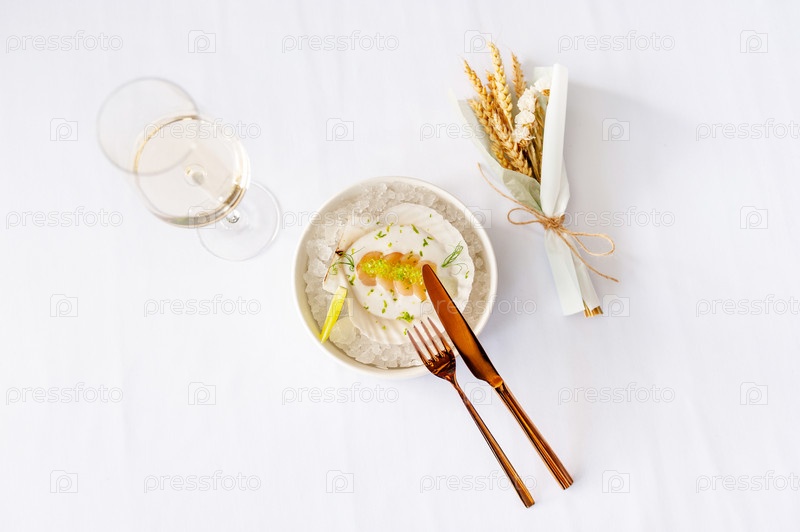 Гребешок в соусе с икрой летучей рыбы на ракушке на льду в ресторане