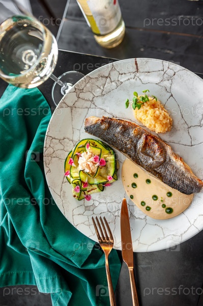 Филе сибаса или дорадо с запеченными цуккини и соусом на серой тарелке