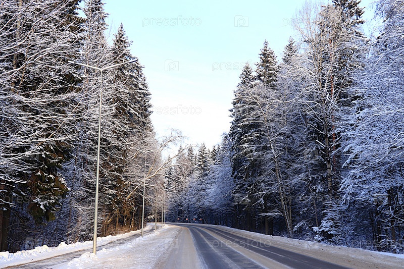 Русская природа зимой, красивый рождественский фон. Дорога через еловый лес, где ели падают на землю после снегопада, сильного мороза и трудной дороги. Это красивый зимний баннер, новогодняя открытка