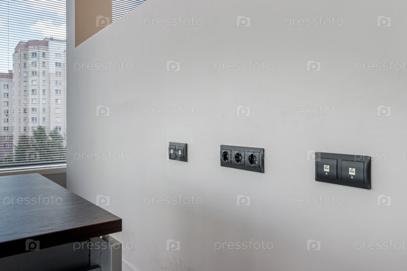 Розетка с разными розетками. Многопанельная розетка, интернет, телевизор или радиоадаптер дымчатого цвета на фоне стены цвета шампанского дома