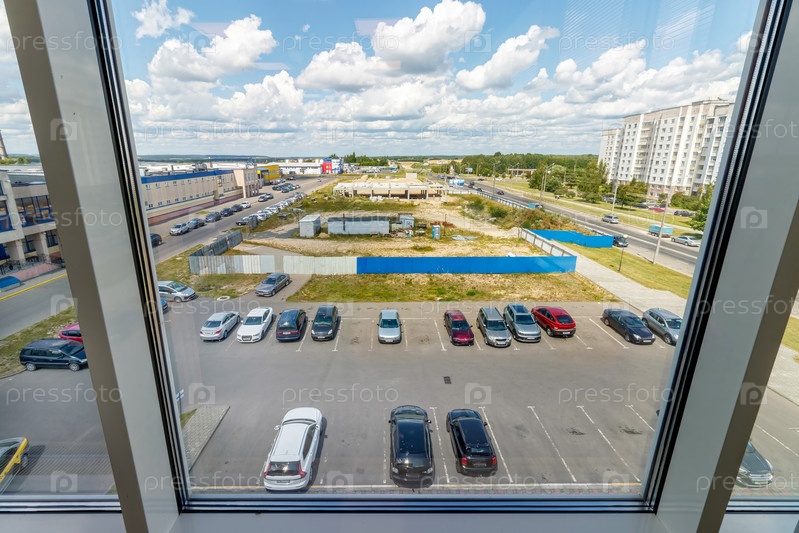 Вид через стеклянное окно на автостоянку возле офисного здания