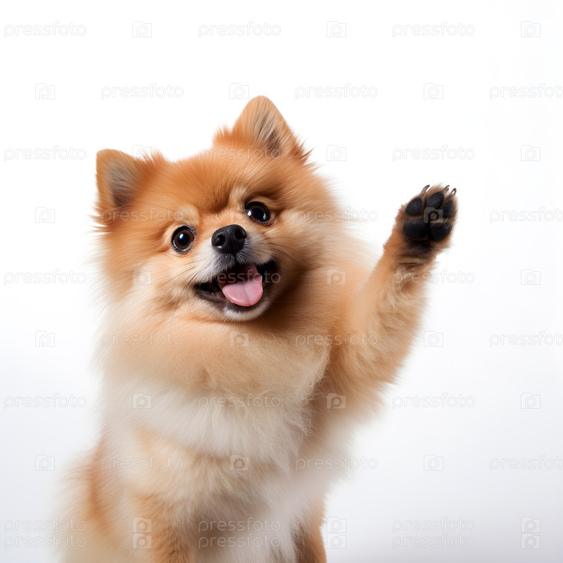 Немецкий шпиц сидит и дает лапу на белом фоне