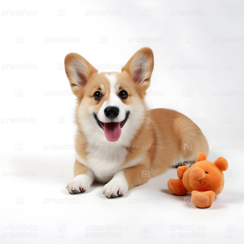 Корги лежит с игрушкой на белом фоне