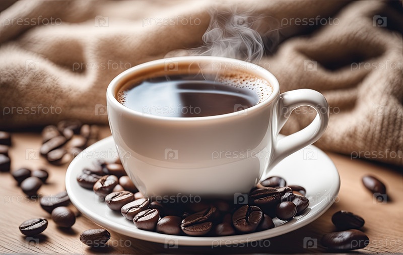 Светлое фото, в бело-бежевых тонах. Чашка горячего кофе с паром на деревянном фоне. Кофейные зерна. Уютная домашняя атмосфера в пастельных тонах