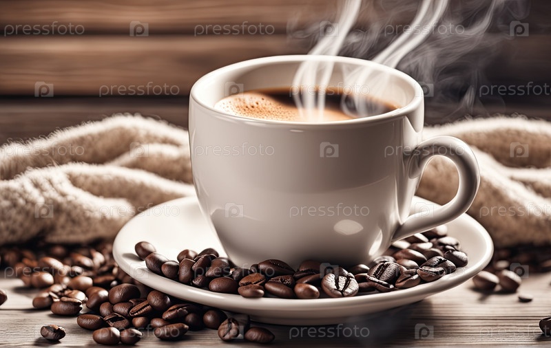 Светлое фото, в бело-бежевых тонах. Чашка горячего кофе с паром на деревянном фоне. Кофейные зерна. Уютная домашняя атмосфера в пастельных тонах