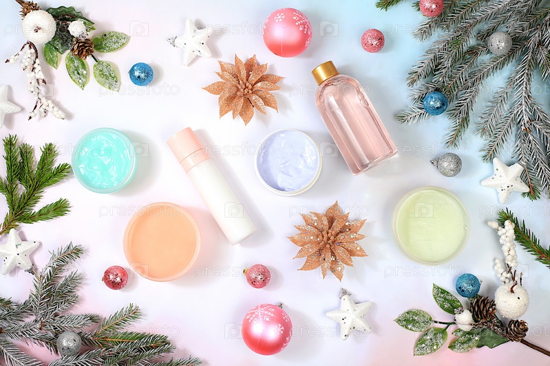 Рождественская спа и оздоровительная композиция с кремами, еловыми ветками, ароматерапией и зимним уходом за кожей, концепция образа жизни, приглашение и рекламный салон, плоская планировка,