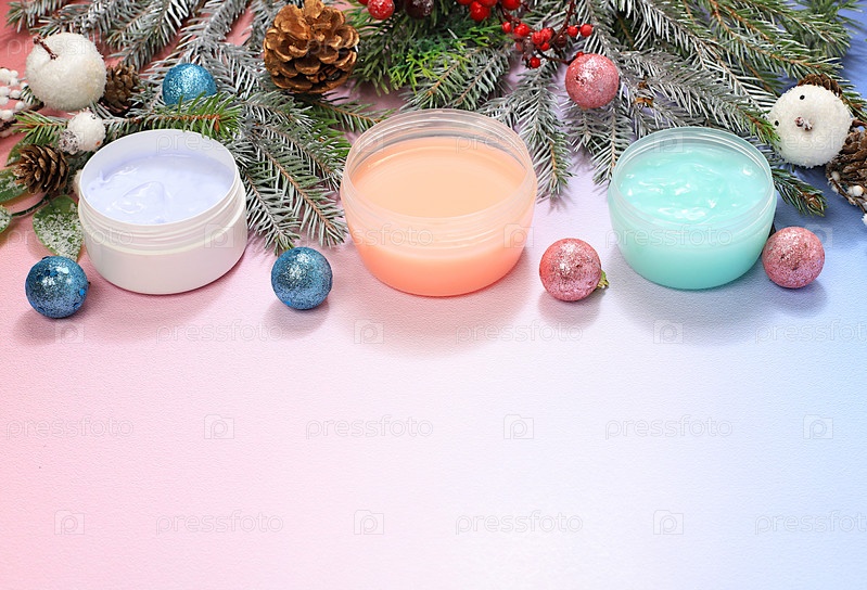 Концепция зимнего ухода за кожей, баннер, рождественская и новогодняя спа-композиция с еловыми ветками, украшения и косметика с местом для текста, рекламное приглашение спа-салона,
