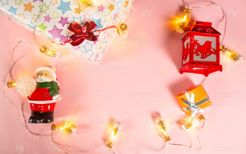 Рождественский фон — рождественские украшения — гирлянда, подарочная коробка, фонарик и медведь в костюме Санта-Клауса на светло-розовом фоне, копируют пространство