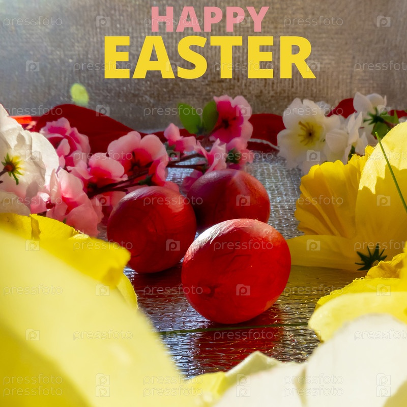 Яркий пасхальный серебряный фон, украшенный лентами из цветов и красными яйцами. Праздничная открытка