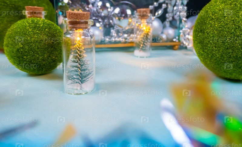Волшебная гирлянда — игрушечные елки в стеклянных банках и шарики из зеленой травы на синем фоне. стеклянная шкатулка с серебряными украшениями