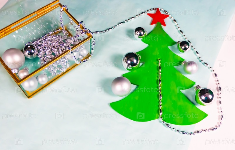 Серебряные украшения выходят из стеклянной и золотой шкатулки и украшают плоскую рождественскую елку на черно-синем фоне