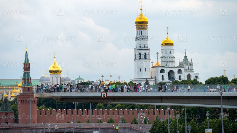 Москва, 01 июля 2023 г., Плавучий мост в парке "Зарядье" с туристами крупным планом