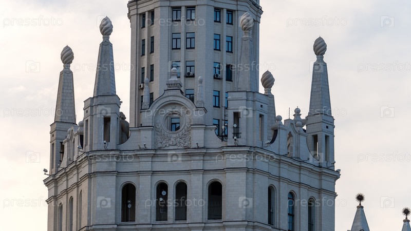 Москва, 01 июля 2023 г., Высотное здание на Котельнической набережной, элементы декора крупным планом