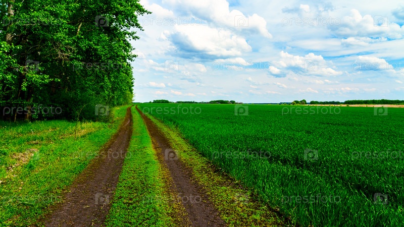 Грунтовая дорога вдоль поля с зелеными злаками, слева вдоль дороги лесополоса