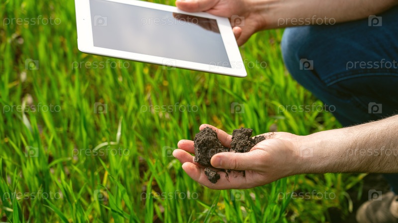 Фермер с планшетом и почвой в руках, анализ химического состава почвы, количество внесенных минеральных удобрений