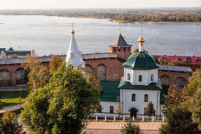 Церковь Симеона Столпника и Белая башня на закате. Вид на храм со смотровой площадки Нижегородского кремля. Россия, Нижний Новгород, август 2023 г