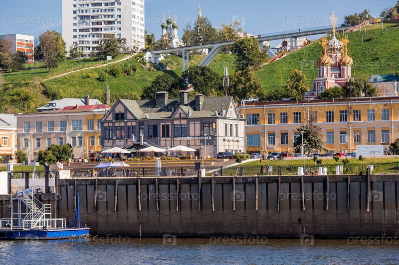 Прекрасный вид на Нижний Новгород с реки Волги в солнечный летний день. Россия, Нижний Новгород, август 2023 г