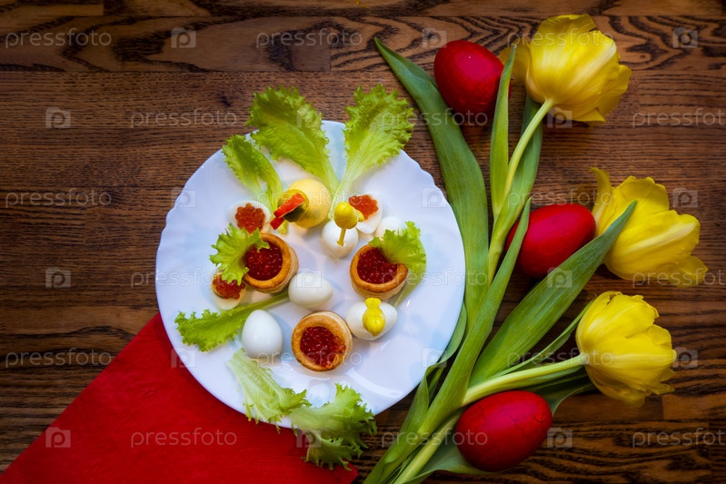 Пасхальная открытка с красными яйцами и желтыми тюльпанами на деревянном столе