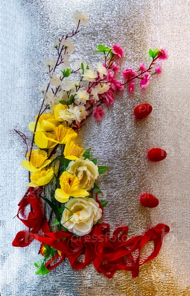 Яркий пасхальный серебряный фон, украшенный лентами из цветов и красными яйцами. Праздничная открытка