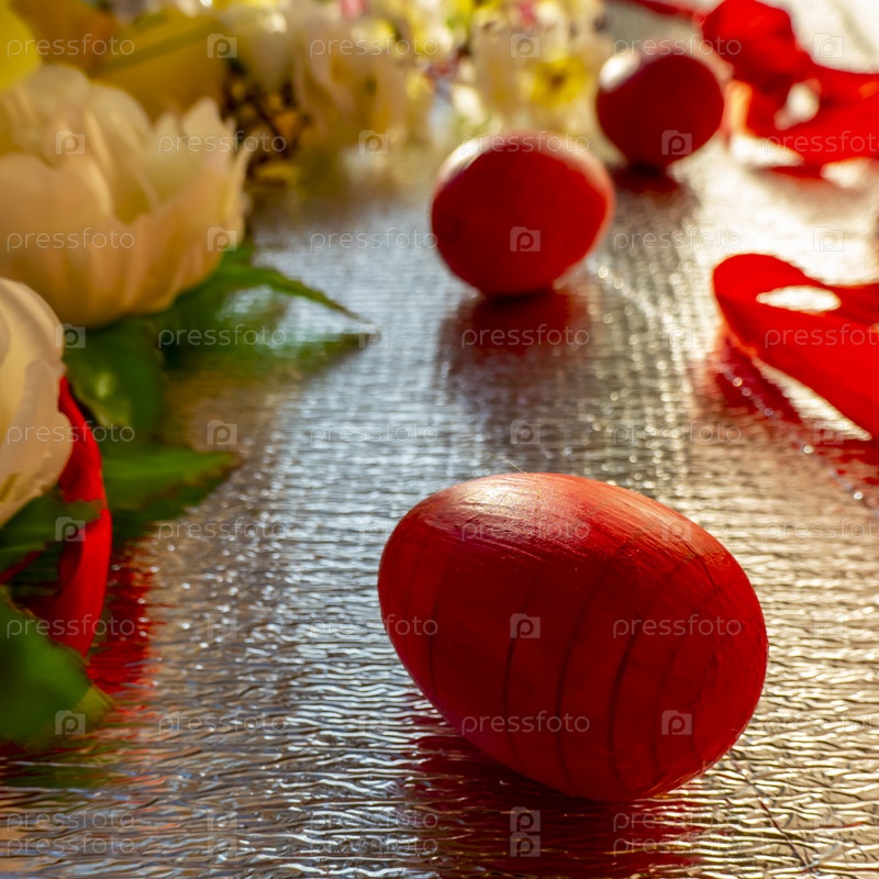 Яркий пасхальный серебряный фон, украшенный лентами из цветов и красными яйцами. Праздничная открытка