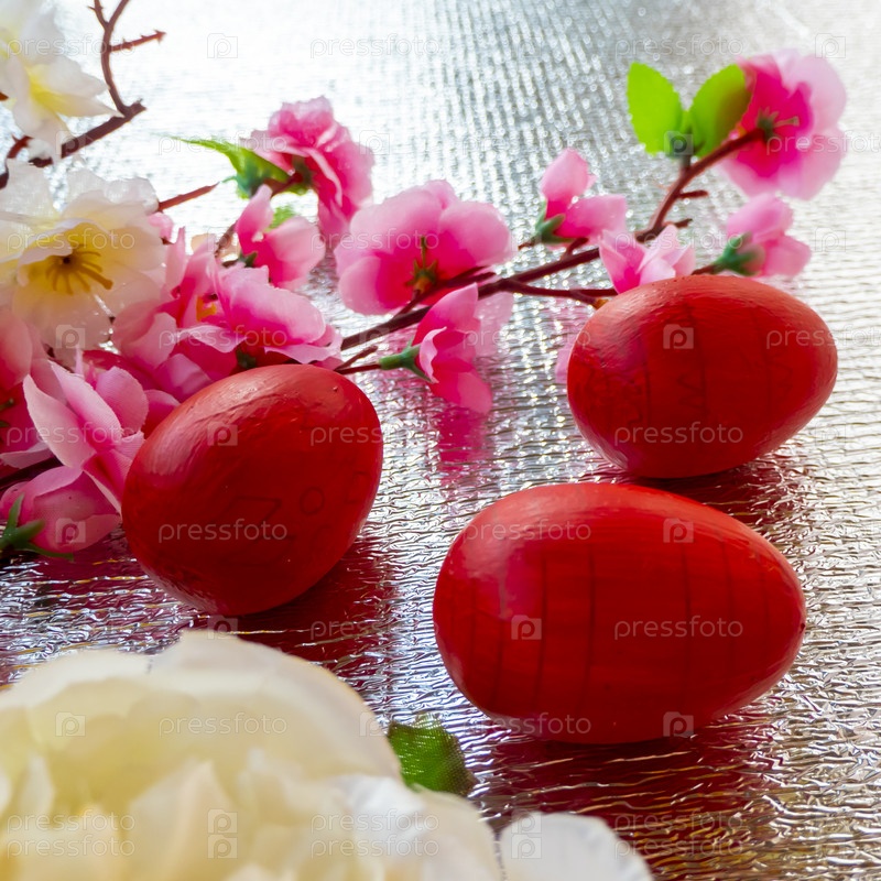 Яркий пасхальный серебряный фон, украшенный лентами из цветов и красными яйцами. Праздничная открытка