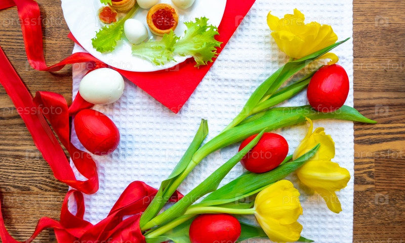 Пасхальная открытка с красными яйцами и желтыми тюльпанами на деревянном столе
