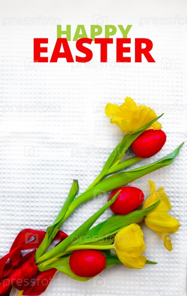 Пасхальная открытка с красными яйцами и желтыми тюльпанами на деревянном столе