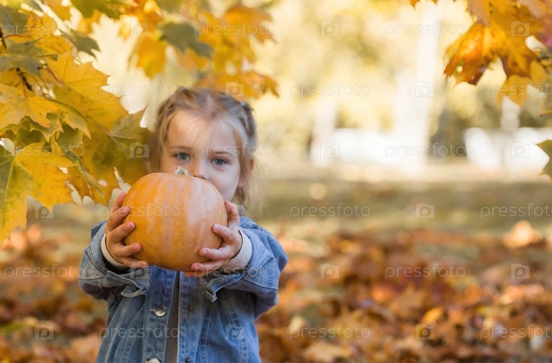 Портрет маленькой девочки 4 лет на открытом воздухе. Счастливый ребенок в осеннем парке с тыквами. Счастливое детство и отцовство
