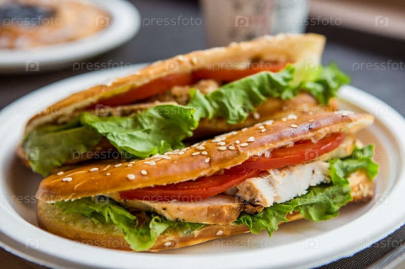 Сэндвич из пшеничного хлеба с помидорами, сырным салатом, зеленью и курицей
