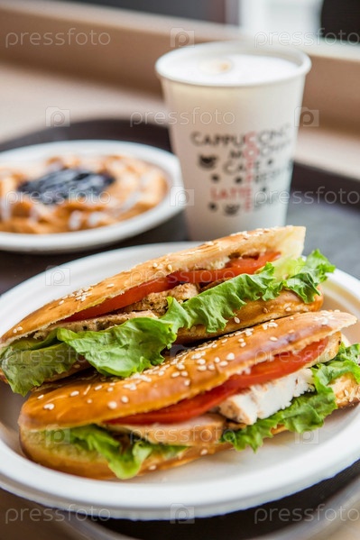 Сэндвич из пшеничного хлеба с помидорами, сырным салатом, зеленью и курицей