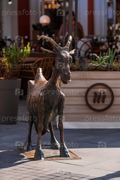 Скульптура веселого козла на Большой Покровской улице. Нижегородский Кремль. Россия, Нижний Новгород, август 2023 г
