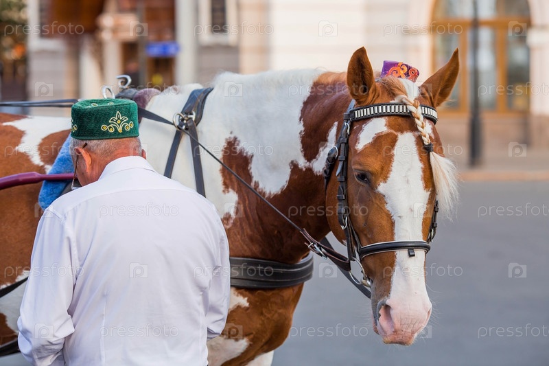 Путешествуйте по России. Карета у стен белого Кремля в Казани, запряженная лошадью в тюбетейке. Россия, Республика Татарстан, г. Казань, сентябрь 2023 г