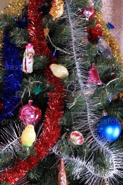 Игрушки на зеленой рождественской ели