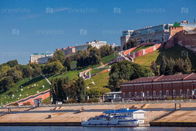 Прекрасный вид на Нижний Новгород и Чкаловскую лестницу с Волги на закате. Россия, Нижний Новгород, август 2023 г