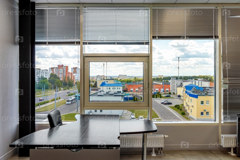 Интерьер современного офиса с огромными панорамными окнами, после ремонта