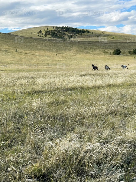 Дикие лошади бегают в степи на острове Ольхон, озеро Байкал, Россия