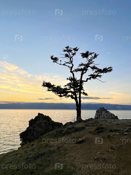 Силуэт кадера возле скалы Шаманка на острове Ольхон на закате, озеро Байкал, Россия