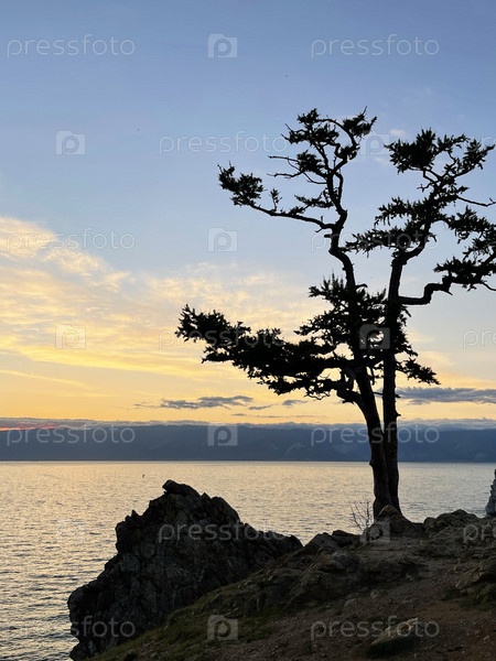 Силуэт кадера возле скалы Шаманка на острове Ольхон на закате, озеро Байкал, Россия