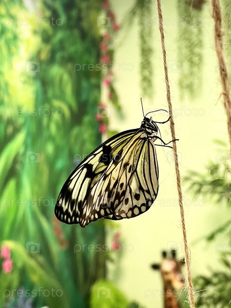 Красивая бабочка сидит на нитке в комнате с яркими стенами