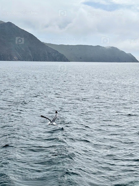 Чайка летит в небе над озером Байкал