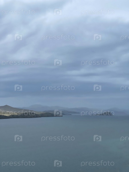 Вид на Байкал ранним утром, туманная дымка над водой. Мрачный суровый пейзаж