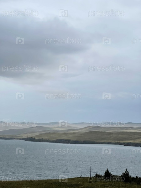 Вид на Байкал ранним утром, туманная дымка над водой. Мрачный суровый пейзаж