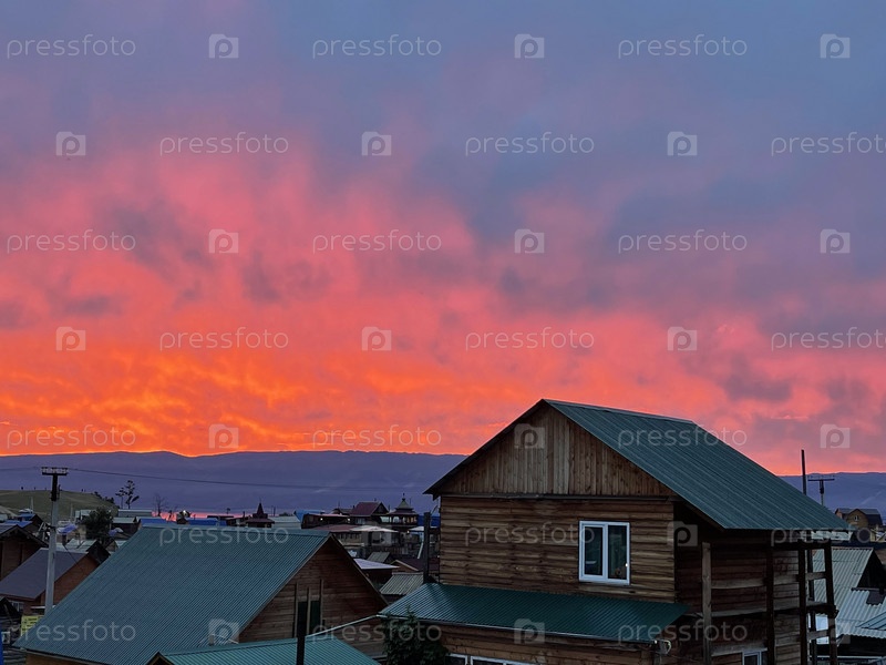 Необычайно яркий, огненно-красный закат над поселком Хужир, Ольхон, Байкал, Россия