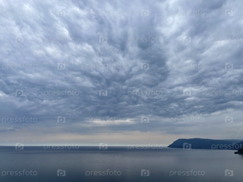 Тяжелые серые облака над озером Байкал, хмурый дождливый день, туманная дымка над водой