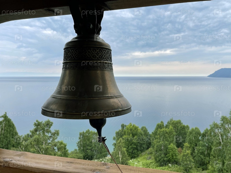 Колокол в звоннице христианской церкви на фоне озера Байкал, Россия