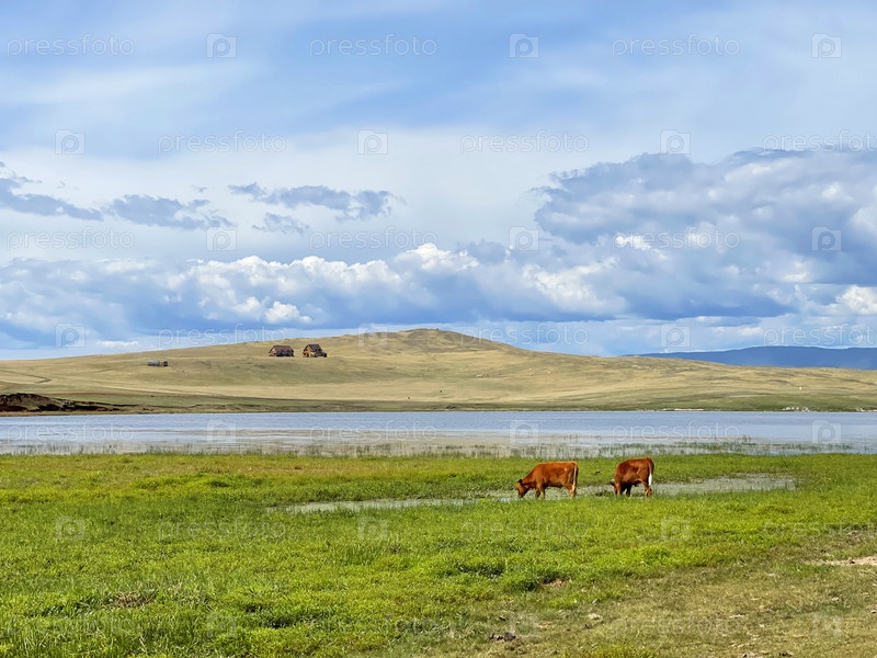 Коровы пасутся возле озера Байкал, Россия