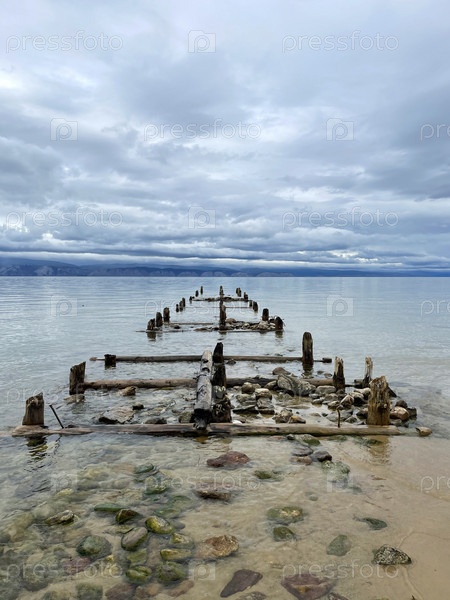 Старый разрушенный пирс на берегу озера Байкал, Ольхон, Россия